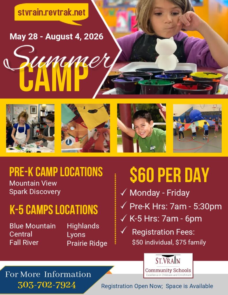 St. Vrain’s Department of Early Childhood Education invites families to a fun-filled Family Resource Fair celebrating the Week of the Young Child. Families with young children are invited to enjoy hands-on activities, explore local programs, and connect with community resources on Thursday, April 16 from 4:00-6:00 p.m. at the St. Vrain Innovation Center, 33 Quail Road, Longmont.