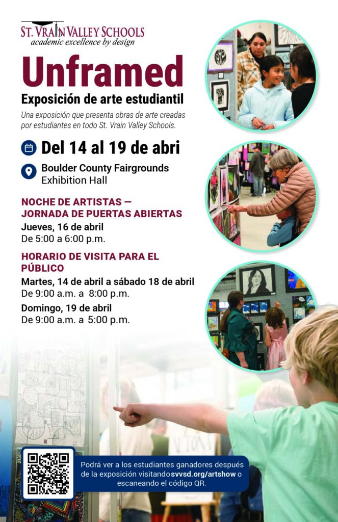 St. Vrain Valley Schools invites the community to its annual Art Show at the Boulder County Fairgrounds Exhibition Hall from April 14-19, featuring artwork from students of all grade levels across the district. The event is free and open to the public, with viewing hours Tuesday through Saturday from 9:00 a.m. to 8:00 p.m. and Sunday from 9:00 a.m. to 5:00 p.m. There will also be a special Artists’ Night Open House on Thursday, April 16 from 5:00 to 6:30 p.m. Join us in celebrating students’ creativity through ceramics, digital art, drawing, jewelry, metalwork, mixed media, painting, and printmaking.