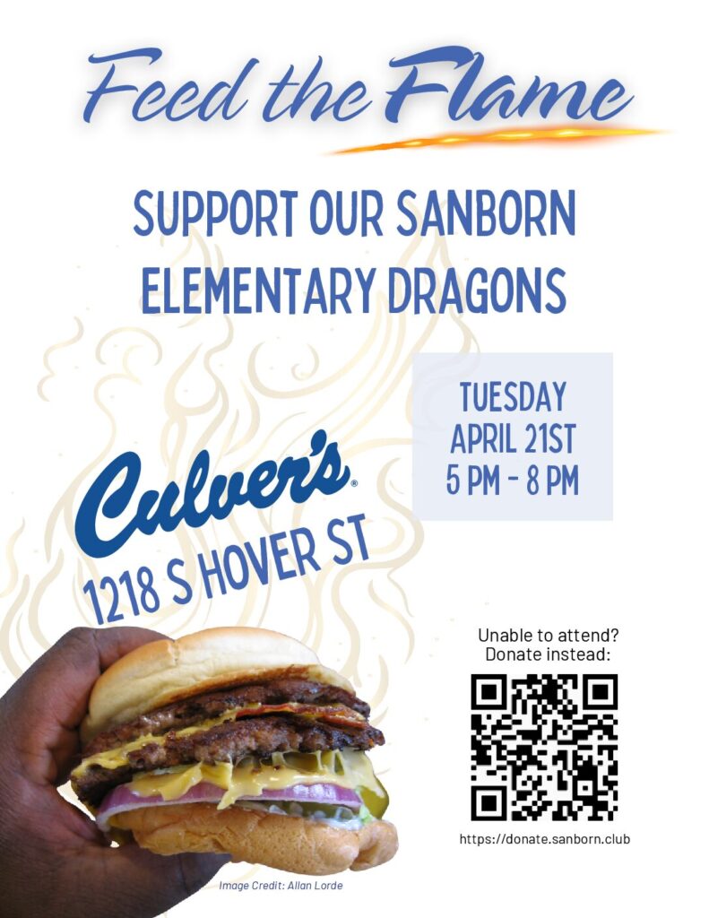 4/21/26 Sanborn Night at Culver’s 5-8PM–flyers in Tuesday folders today
